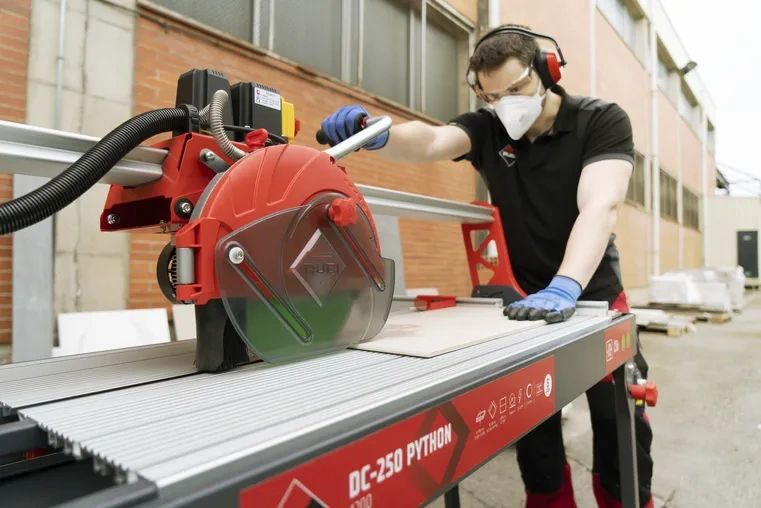 Precision cutting for porcelain stoneware and ceramic tiles is the primary focus of the Rubi DC-250 Python 850. This professional electric cutter is built with a high-performance moving head and a plunge-cut capability, allowing for adjustable cutting heights. Its aluminium chassis ensures a lightweight yet rigid structure, providing the stability required for intensive on-site tiling work.